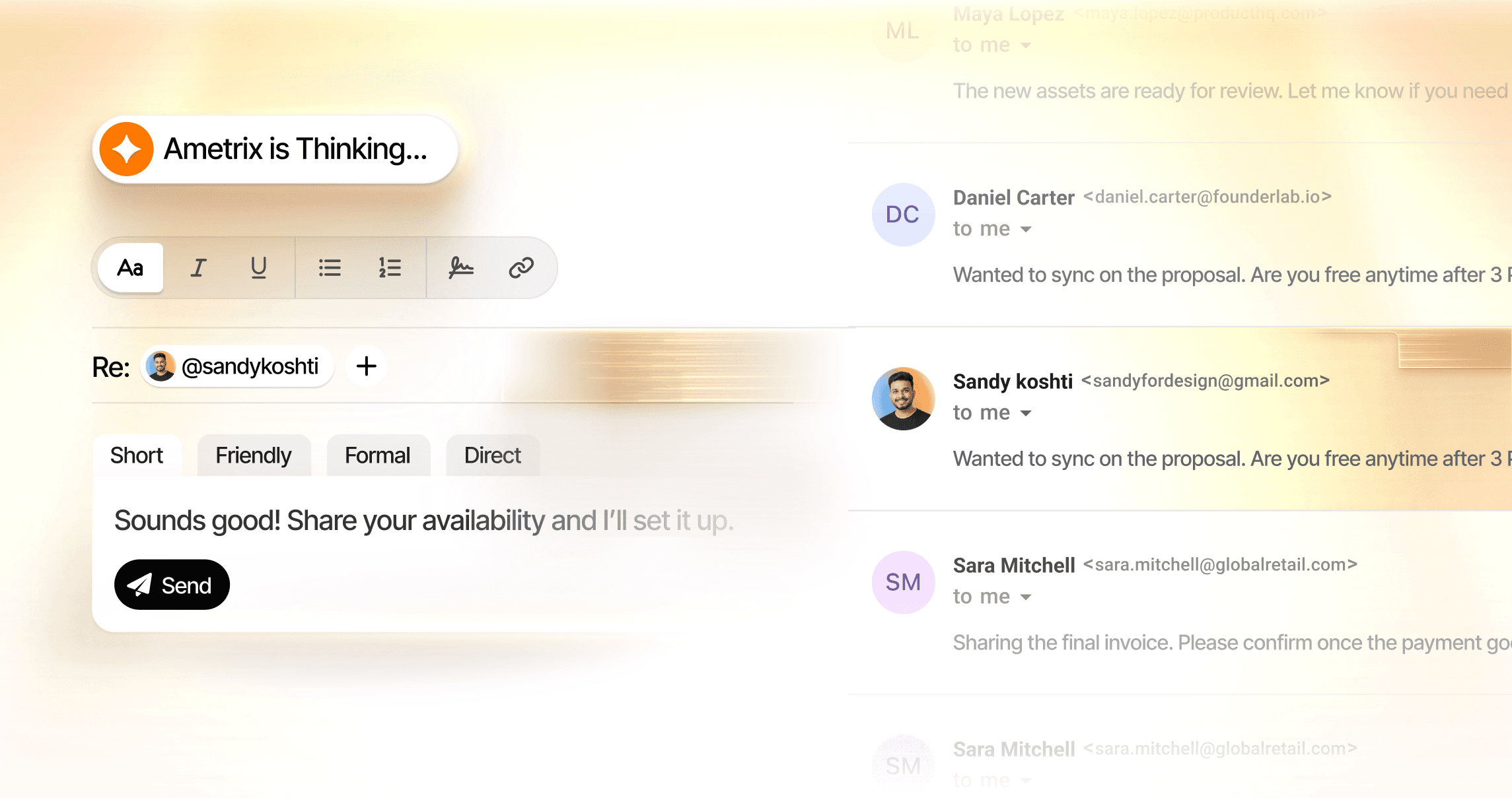 Ametrix is an AI-powered inbox automation platform that drafts replies, schedules follow-ups, scores leads, and organizes email workflows so teams can move faster with less manual effort.